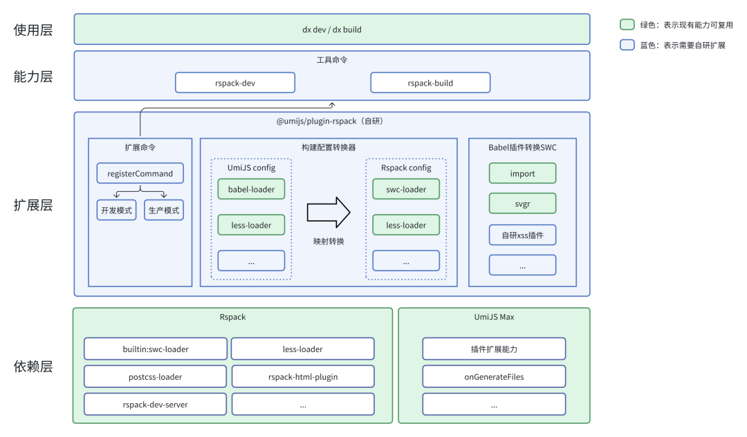 方案基于 UmiJS 的 max 扩展,原本 UmiJS 的扩展能力不受影响。业务高使用率 Babel 插件有现成的 SWC 扩展能力可直接替换(比如:Babel-plugin-import、svgr 等),少部分自研插件需要使用 Rust 重写。