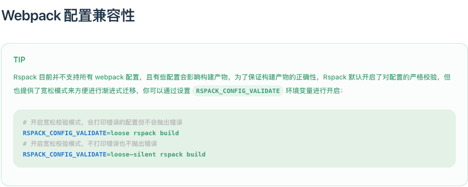 - webpack 转 Rspack:Rspack 项目内平移了大量的 webpack 测试用例用于保障一致性,另外默认严格模式,出现不兼容配置会抛出错误中断构建,保证了基础方面的稳定性。