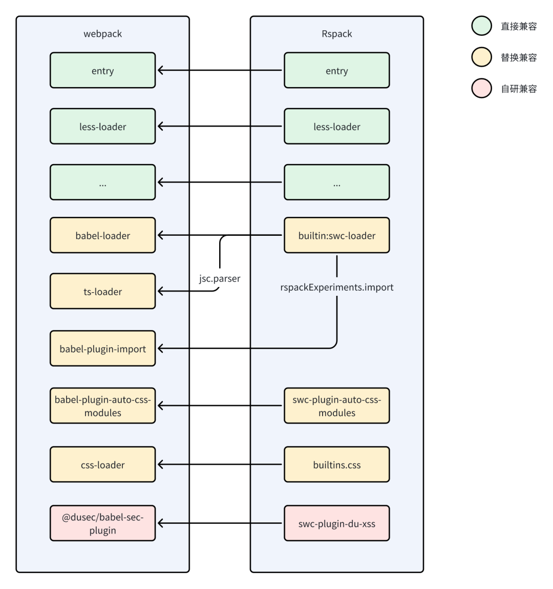所以整体上还是以沿用 webpack 原有扩展加 Rspack 官方能力替换为主,只需要针对少部分未支持的 Babel 插件进行扩展即可实现。