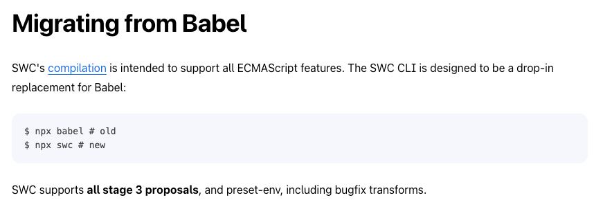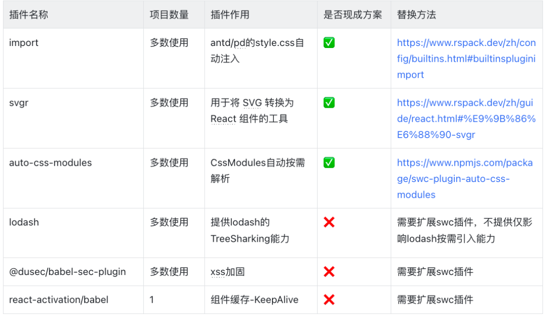 - Babel(v7)转 SWC:SWC 支持所有 stage 3 perposals 、preset-env,JS/TS 语法编译能力上跟 Babel 7 对齐。在插件生态上不一致,若有使用 Babel 插件,需要考虑替换方案(详情参考前文中的 Babel 插件使用情况)。
