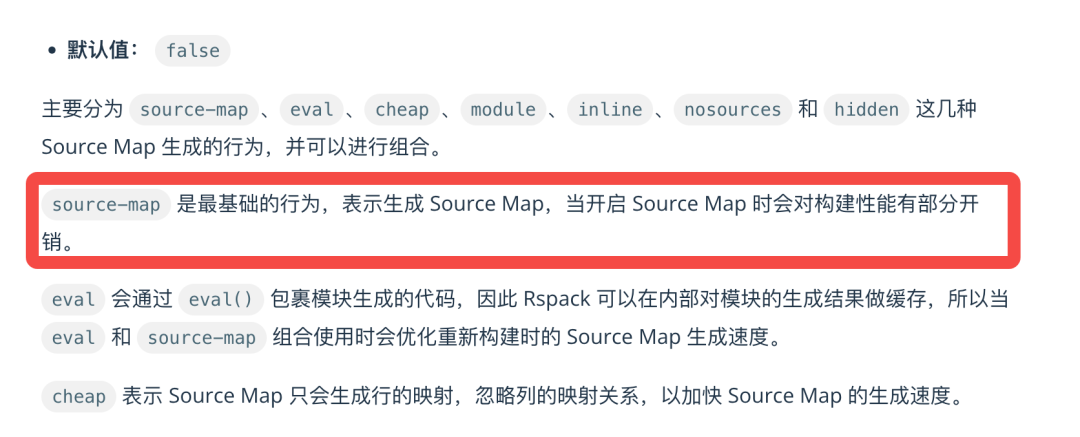 在以往使用 webpack 的 devtool 时,也能感受到有一定的性能开销;同时在 Rspack 中,官方文档中也有说明当 devtool 开启并设置 sourcemap 时有性能开销。官方文档: