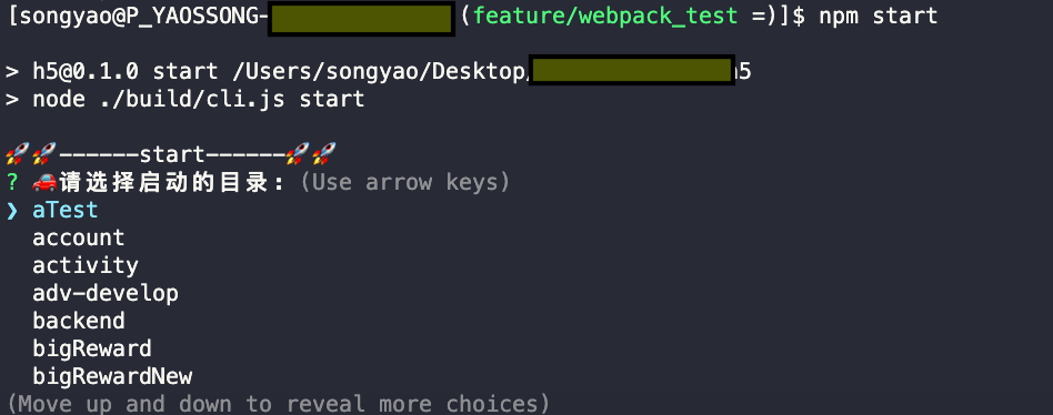 // 未输入项目名称则开启交互命令行function openInquirer() { // 获取所有可启动目录 const projectList = fs.readdirSync(path.resolve(__dirname, '../src/pages')) // console.log('projectList', projectList) const promptList = [ { type: 'list', message: '🚗请选择启动的目录:', name: 'pro', choices: [...projectList], }, ] inquirer.prompt(promptList).then((answers) => { console.log(answers) appName = answers.pro start() })}当你直接npm start的时候,可以让你选择你想要启动的目录: