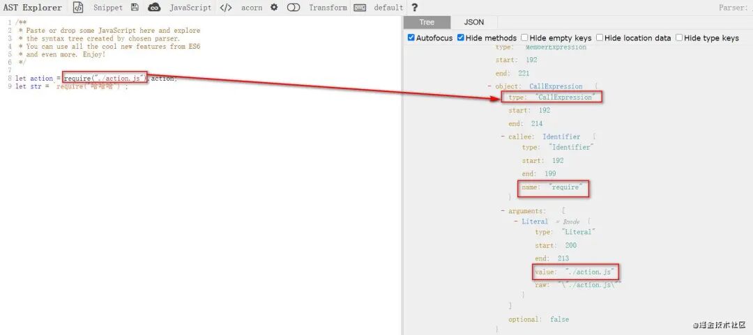 我们可以发现,babel将上面代码转换成 ast 后,我们可以准确地获取到require这个节点的类型为CallExpression,节点的name为require,参数的 value 为./action.js,这样的话就能够正确区分出用于引用的require和作为值或者变量的require了。因此,我们需要修改一下获取依赖的这个函数的实现: