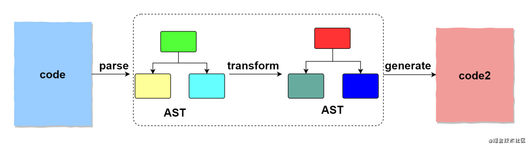 关于babel的原理啥的大家可以去找其他文章看。这里大家简单地记住 babel 的核心就是解析 (parse),转换 (transform),生成 (generate) 这三个步骤,如下图所示。