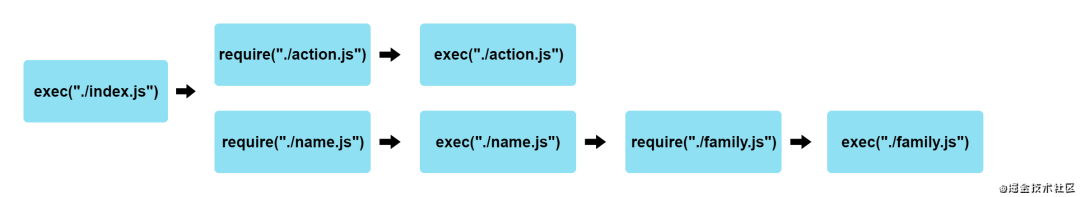 ./action.js,于是调用exec("./action.js")。这时候不存在其他依赖了,那么直接返回值。这条线结束。存在依赖