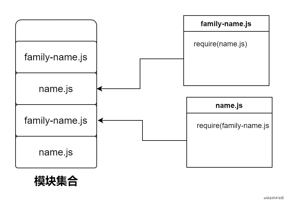 我们知道模块之间可以互相引用,比如 name.js 模块引入了 family-name.js 模块。而在 family.js 模块中又引入了 name.js 模块。如下图所示: