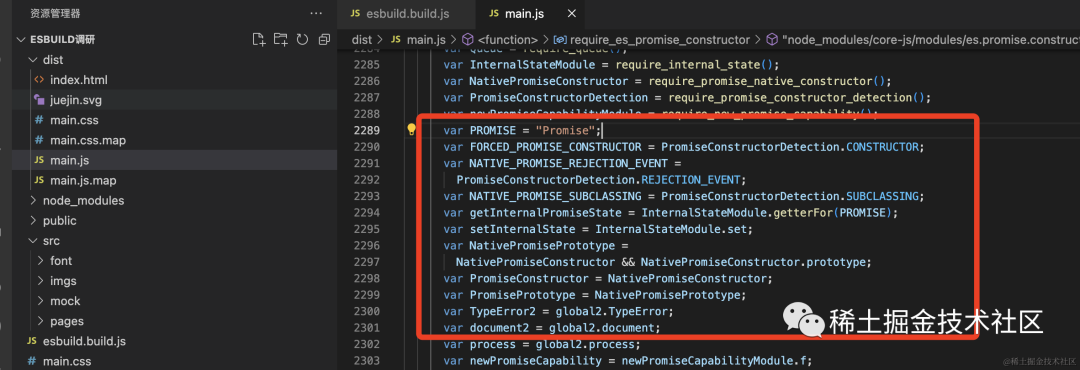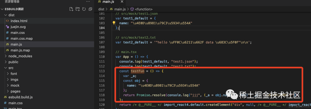 // 省略其他const App: FC = () => { const testFun = () => { const obj = { name: "不要秃头啊", }; return Promise.resolve(console.log("jjj", obj.name ?? "测试??")); };};查看打包后的文件:发现 「esbuild」 已经帮我们对 ?? 语法做了向下兼容。