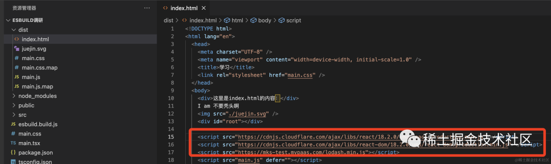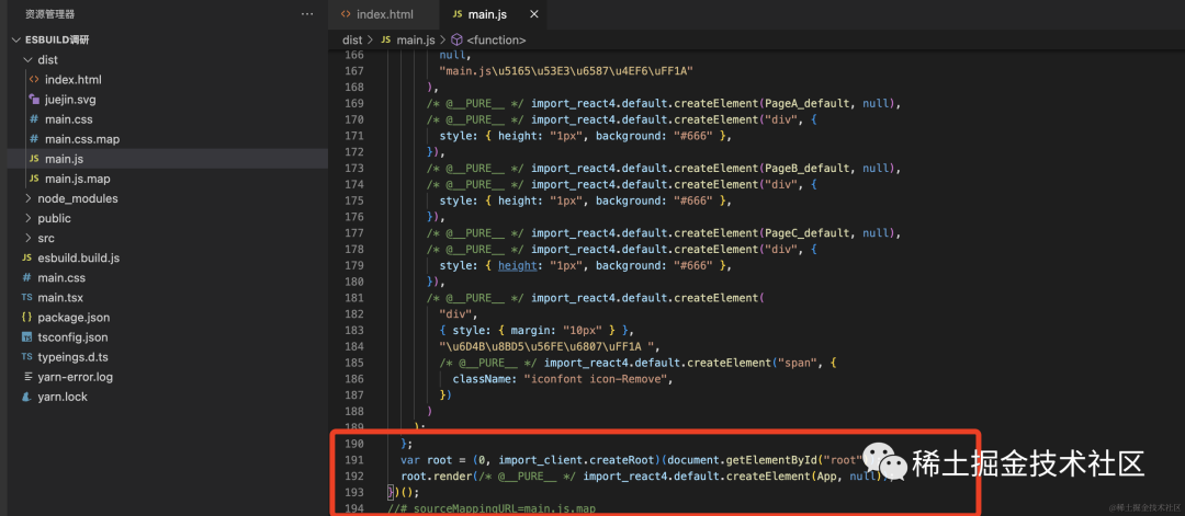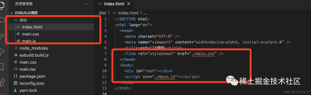 const esbuild = require("esbuild");const entryPoints = ["main.tsx"];const options = { // 入口文件 entryPoints, // 启动打包 bundle: true, // 输出目录文件夹 outdir: "dist",};esbuild.build(options).catch((e) => console.log(e));「main.tsx:」