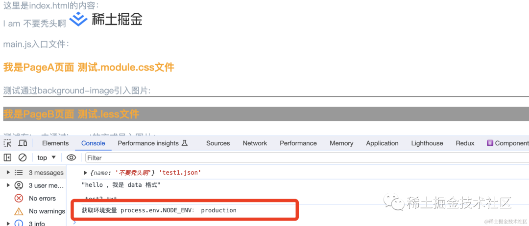 // 省略其他 const options={ // define 的本质其实就是字符串替换 define: { "process.env.NODE_ENV": `"${process.env.NODE_ENV || false}"`, // 设置 NODE_ENV }, }这样,我们在 「node」 环境或 「web」 环境中都能成功拿到process.env.NODE_ENV 属性。