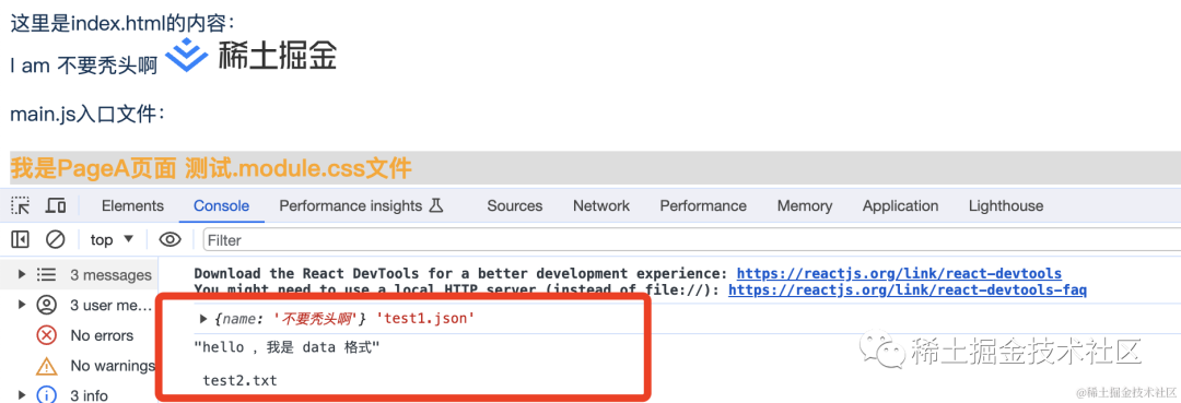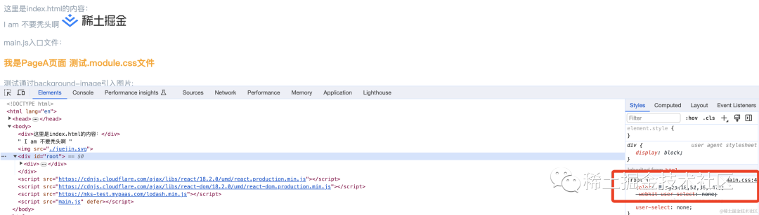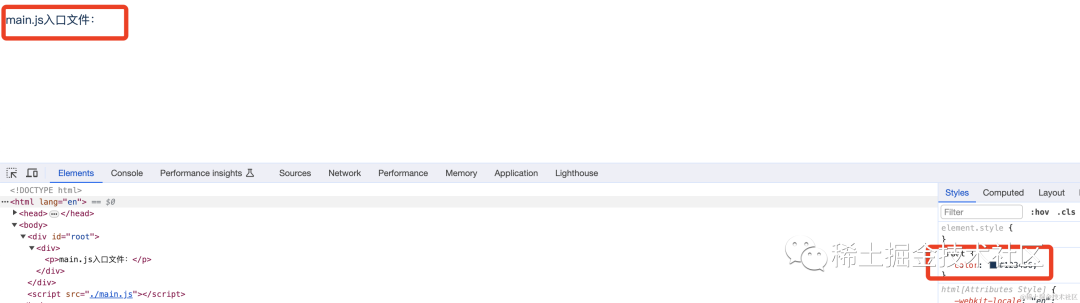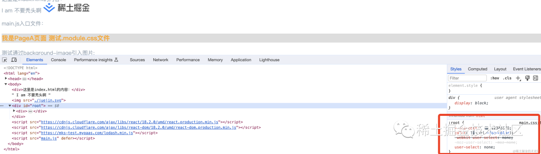 import { createRoot } from "react-dom/client";import React, { FC } from "react";import "./main.css";const App: FC = () => { return ( <div> <p>main.js入口文件:</p> </div> );};const root = createRoot(document.getElementById("root") as HTMLElement);root.render(<App />);「main.css:」