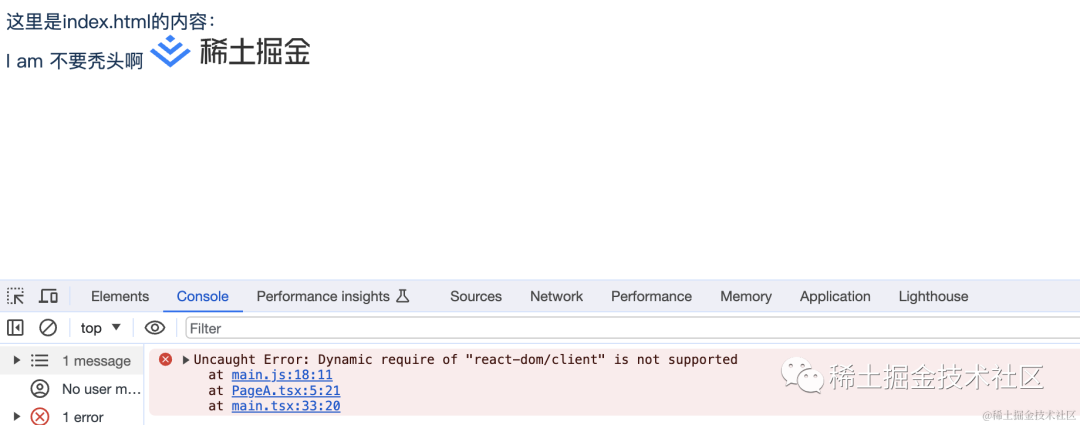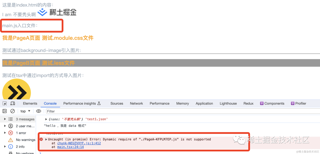 将入口文件 「main.tsx」 文件名后缀改为 「main.js」 后再重新进行打包:不出意外的报错了: