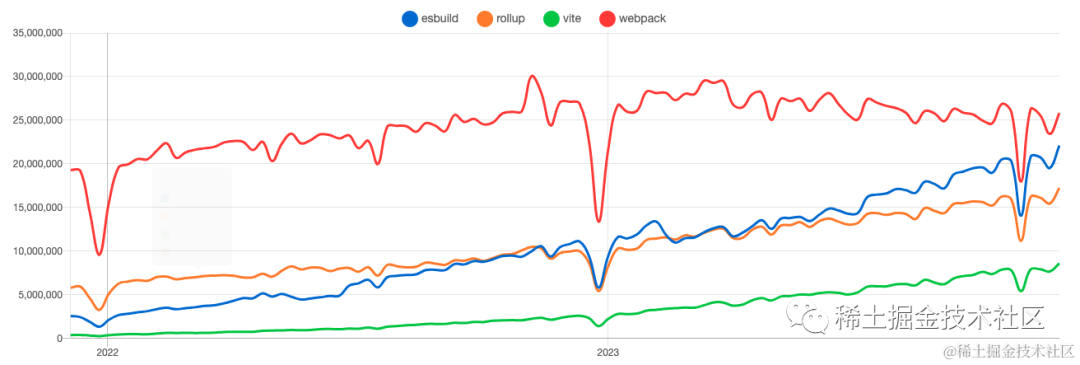 近两年来,esbuild 的 npm 下载量也呈现出迅猛增长的趋势,一副要和老大哥 Webpack 争一争这头把交椅的味道。