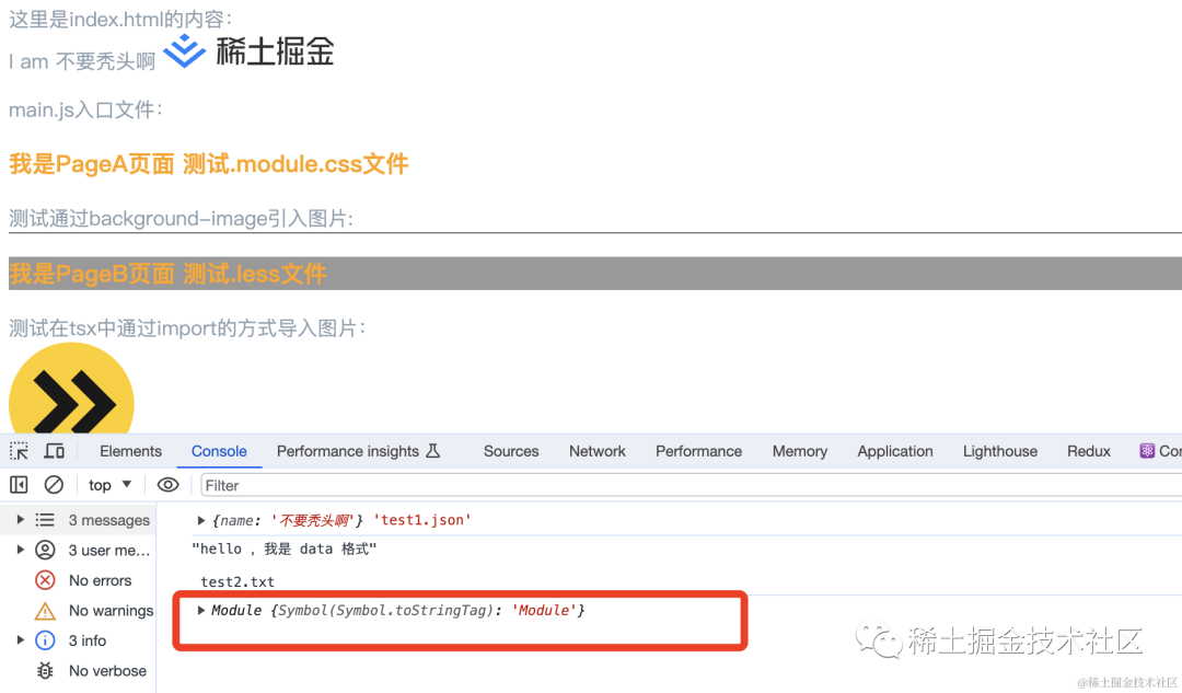 // 省略其他const options={ plugins:[ htmlPlugin({ files: [ { // scriptLoading ('blocking' | 'defer' | 'module'): 决定是否将脚本标签插入为阻塞脚本标签,带有 defer=""(默认),或带有 type="module"。+ scriptLoading: "module", }, ], }), ]}在 「main.tsx」 中写一个 import 动态导入的例子:
