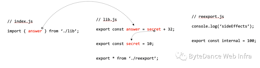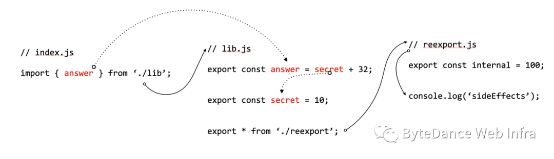 export const answer = 42;export const secret = 10;这里的 lib 虽然本身没导出,但是对 internal 进行了重导出,我们深度分析,查找出 answer 最终定义的地方。