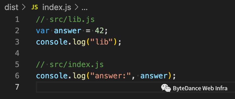 // src/reexport.jsconsole.log("internal");// src/lib.jsvar answer = 42;console.log("lib");// src/index.jsconsole.log("answer:", answer);各个模块的副作用代码都得到保留,这符合预期。在配置下sideEffects:false看下结果: