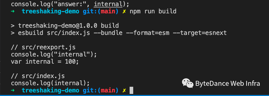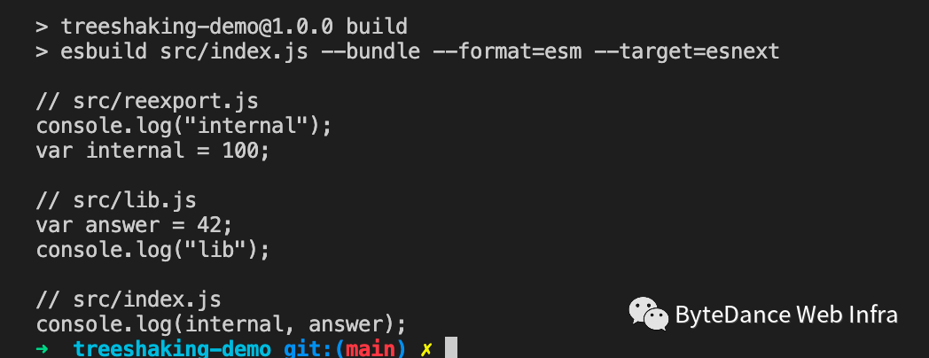 export const answer = 42;export const secret = 10;这里虽然在 lib 里导出了 secret,但是并未在 index.js 里使用,因此可以删除,结果仍然为: