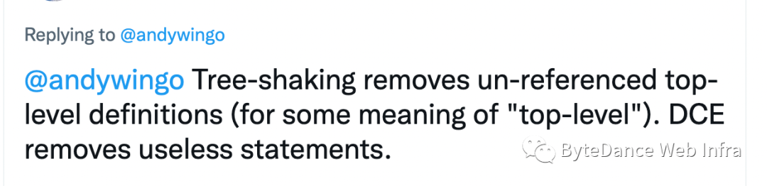 function top_level(){ // this is top_level function declartion function inner(){ // this is not top_level } let b = 20; // this is not top_level}let a = 10; // this is top_level variable declartion因此我们的后续讨论,所说的 tree shaking 均是指基于 LTO 的 DCE,而 DCE 指的是不包含 tree shaking 的其他 DCE 部分。