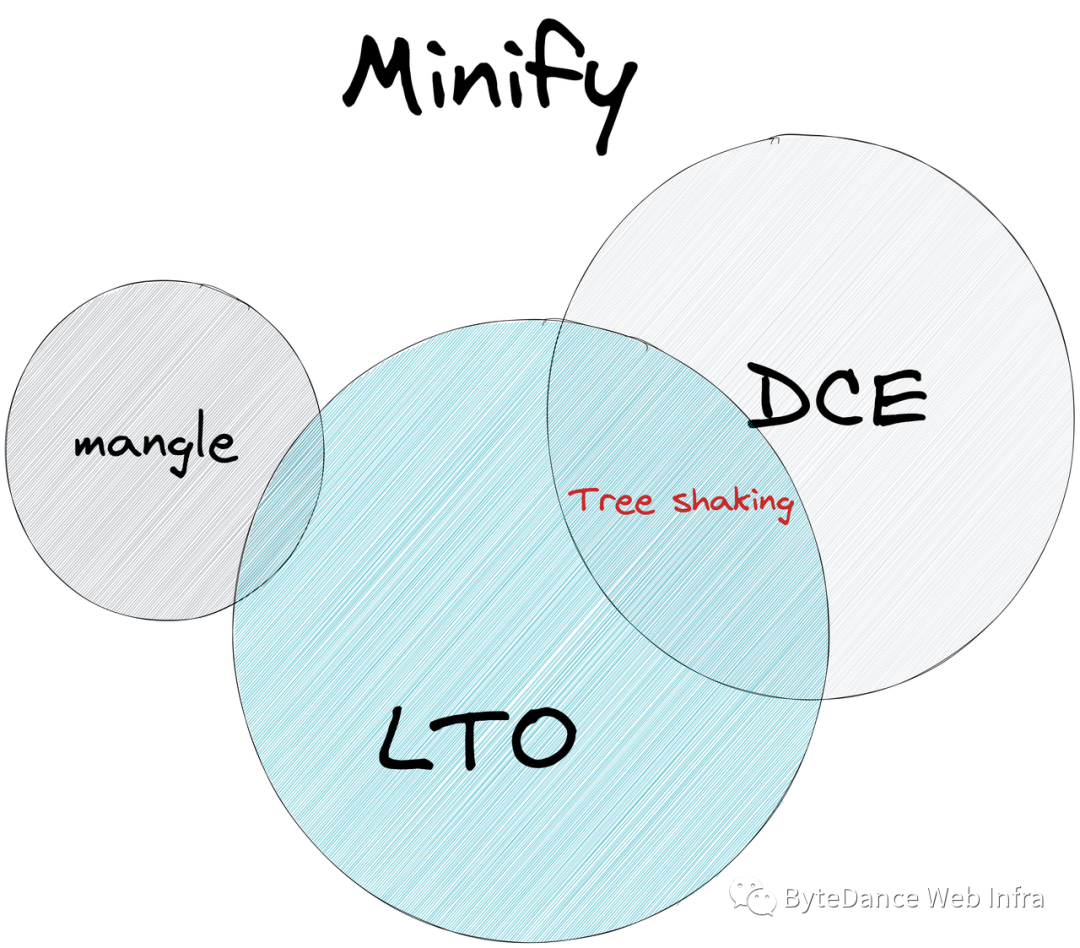 minify:编译优化手段,指在不影响代码语义的情况下,尽可能的减小程序的体积,常见的 minify 工具如 terser、uglify,swc 和 esbuid 也自带 minify 功能。
