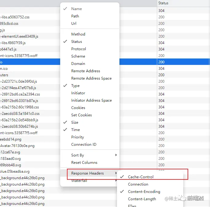 一开始是没有 Cache-Control 这一栏的,需要手动设置一下,在头部右键勾选上 Cache-Control 即可。