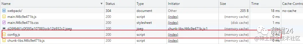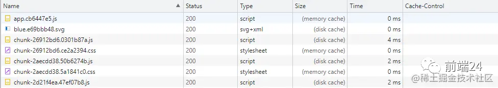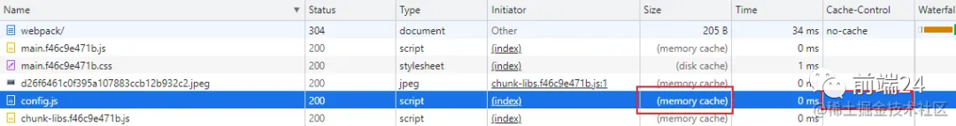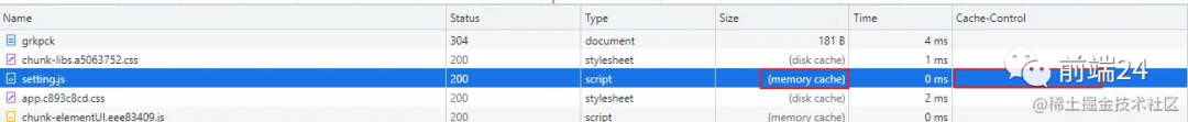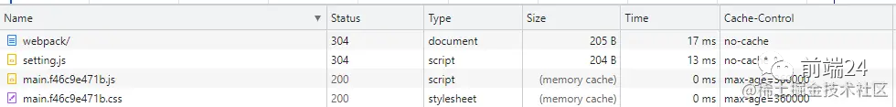 Size栏:disk cache 代表走磁盘缓存,memory cache 走内存缓存;Cache-Control栏:查看缓存策略,可以看到配置文件 setting.js 没有配置任何缓存策略