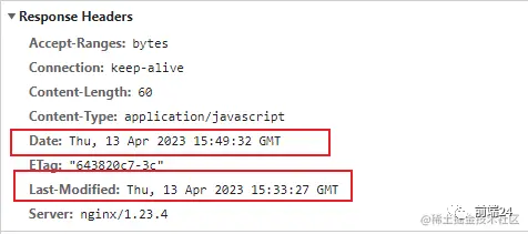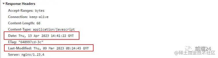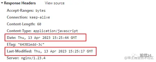 再看下该文件响应头中的 Date 和 Last-Modified 信息,这里的这两个时间是决定下次刷新页面之后,是请求服务器还是走本地缓存的关键因素,注意是下一次请求!
