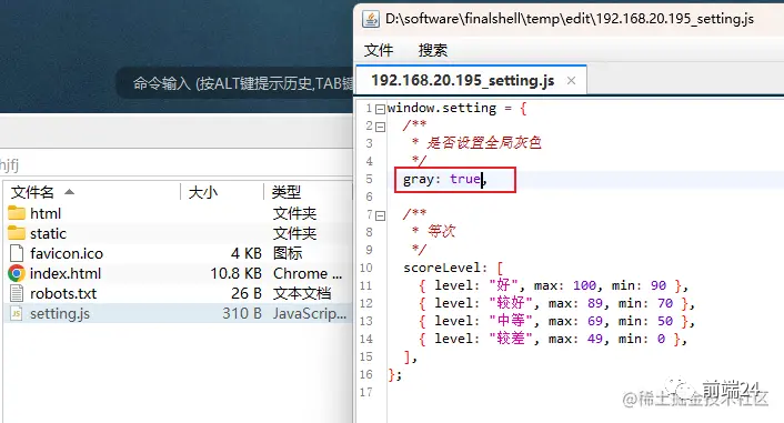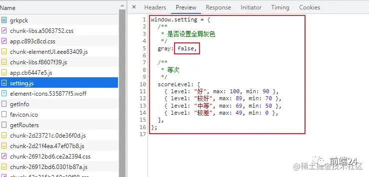 此时正好赶上一个需求,需要把页面所有内容设置为灰色,因为事先在配置文件里面配置了,所以此时只需要在 setting.js 中把 gray 改为 true 即可,如下图所示,这个文件是没有设置缓存策略的,走的默认缓存,获取的是内存中【memory cache】的缓存;