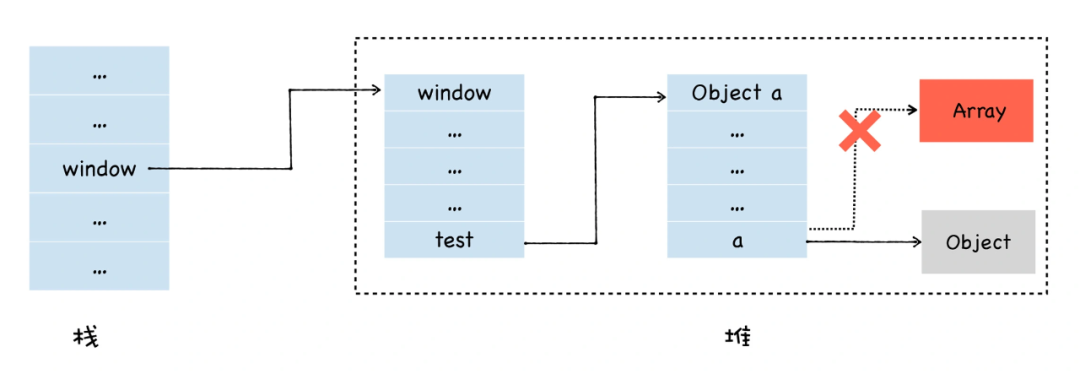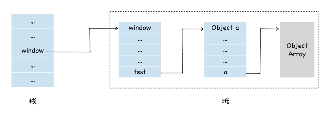 从上图我们可以看出,栈中保存了指向 window 对象的指针,通过栈中 window 的地址可以找到 window 对象,通过 window 对象可以找到 test 对象,通过 test 对象可以找到 a 数组。
