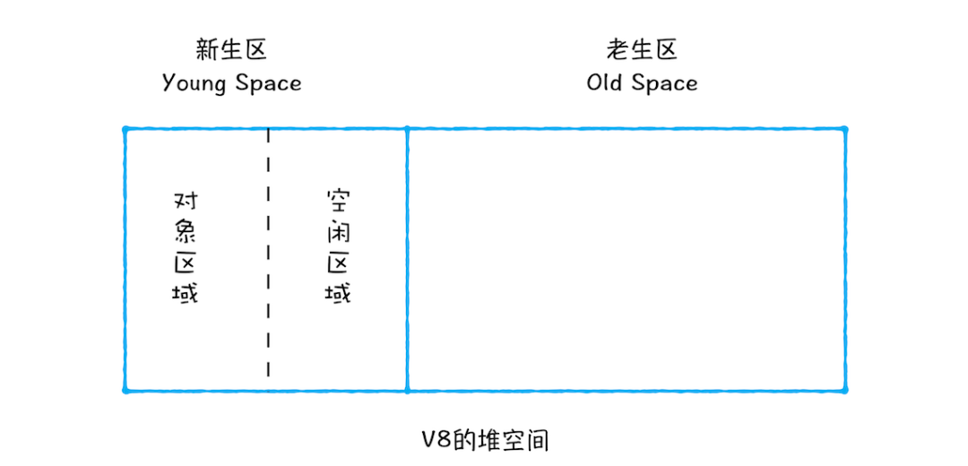 新生代中用 Scavenge 算法来处理。所谓 Scavenge 算法,是把新生代空间对半划分为两个区域,一半是对象区域,一半是空闲区域,如下图所示: