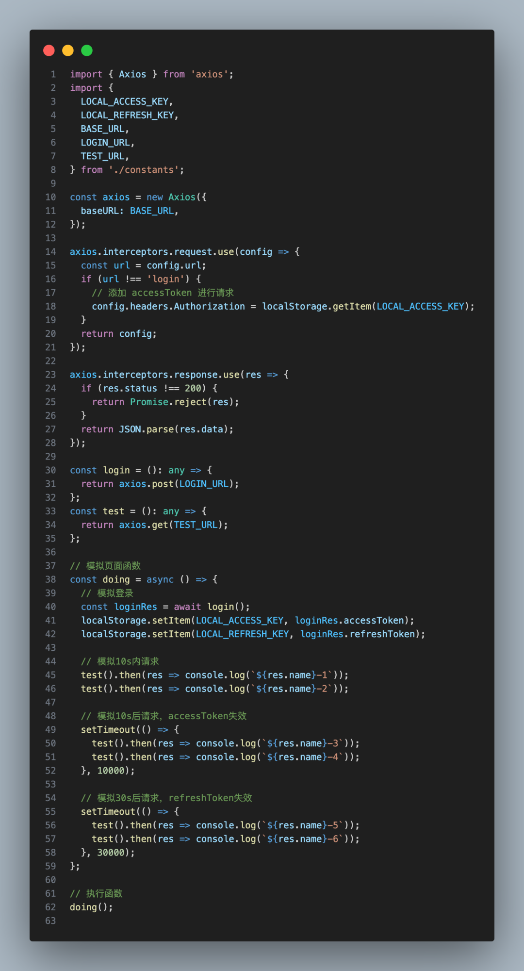 import { Axios } from 'axios';import { LOCAL_ACCESS_KEY, LOCAL_REFRESH_KEY, BASE_URL, LOGIN_URL, TEST_URL, FETCH_TOKEN_URL,} from './constants';import { AxiosRetry } from './retry';const axios = new Axios({ baseURL: 'http://localhost:8888',});axios.interceptors.request.use(config => { const url = config.url; if (url !== 'login') { config.headers.Authorization = localStorage.getItem(LOCAL_ACCESS_KEY); } return config;});axios.interceptors.response.use(res => { if (res.status !== 200) { return Promise.reject(res); } return JSON.parse(res.data);});const axiosRetry = new AxiosRetry({ baseUrl: BASE_URL, url: FETCH_TOKEN_URL, unauthorizedCode: 401, getRefreshToken: () => localStorage.getItem(LOCAL_REFRESH_KEY), onSuccess: res => { const accessToken = JSON.parse(res.data).accessToken; localStorage.setItem(LOCAL_ACCESS_KEY, accessToken); }, onError: () => { console.log('refreshToken 过期了,乖乖去登录页'); },});const get = (url, options?) => { return axiosRetry.requestWrapper(() => axios.get(url, options));};const post = (url, options?) => { return axiosRetry.requestWrapper(() => axios.post(url, options));};const login = (): any => { return post(LOGIN_URL);};const test = (): any => { return get(TEST_URL);};// 模拟页面函数const doing = async () => { // 模拟登录 const loginRes = await login(); localStorage.setItem(LOCAL_ACCESS_KEY, loginRes.accessToken); localStorage.setItem(LOCAL_REFRESH_KEY, loginRes.refreshToken); // 模拟10s内请求 test().then(res => console.log(`${res.name}-1`)); test().then(res => console.log(`${res.name}-2`)); // 模拟10s后请求,accessToken失效 setTimeout(() => { test().then(res => console.log(`${res.name}-3`)); test().then(res => console.log(`${res.name}-4`)); }, 10000); // 模拟30s后请求,refreshToken失效 setTimeout(() => { test().then(res => console.log(`${res.name}-5`)); test().then(res => console.log(`${res.name}-6`)); }, 30000);};// 执行函数doing();结语