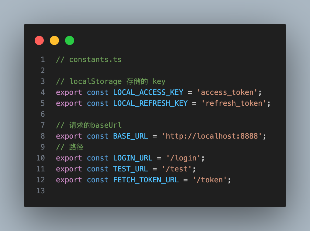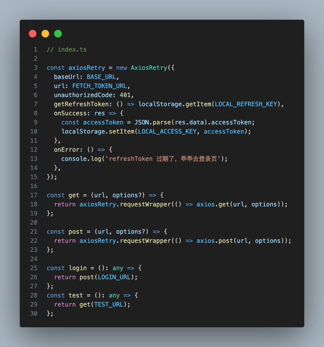 // constants.ts// localStorage 存储的 keyexport const LOCAL_ACCESS_KEY = 'access_token';export const LOCAL_REFRESH_KEY = 'refresh_token';// 请求的baseUrlexport const BASE_URL = 'http://localhost:8888';// 路径export const LOGIN_URL = '/login';export const TEST_URL = '/test';export const FETCH_TOKEN_URL = '/token';retry.ts