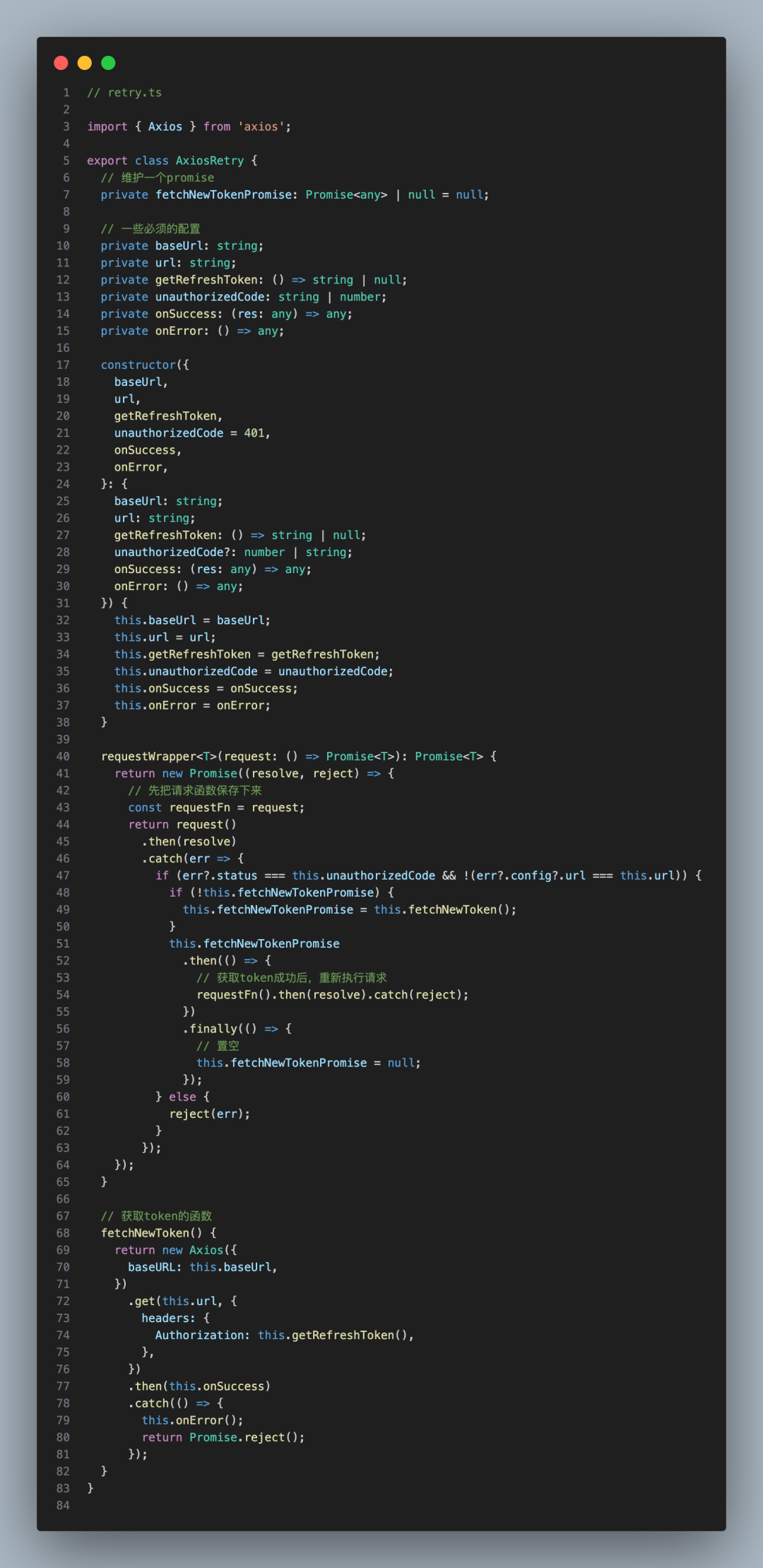 // retry.tsimport { Axios } from 'axios';export class AxiosRetry { // 维护一个promise private fetchNewTokenPromise: Promise<any> | null = null; // 一些必须的配置 private baseUrl: string; private url: string; private getRefreshToken: () => string | null; private unauthorizedCode: string | number; private onSuccess: (res: any) => any; private onError: () => any; constructor({ baseUrl, url, getRefreshToken, unauthorizedCode = 401, onSuccess, onError, }: { baseUrl: string; url: string; getRefreshToken: () => string | null; unauthorizedCode?: number | string; onSuccess: (res: any) => any; onError: () => any; }) { this.baseUrl = baseUrl; this.url = url; this.getRefreshToken = getRefreshToken; this.unauthorizedCode = unauthorizedCode; this.onSuccess = onSuccess; this.onError = onError; } requestWrapper<T>(request: () => Promise<T>): Promise<T> { return new Promise((resolve, reject) => { // 先把请求函数保存下来 const requestFn = request; return request() .then(resolve) .catch(err => { if (err?.status === this.unauthorizedCode && !(err?.config?.url === this.url)) { if (!this.fetchNewTokenPromise) { this.fetchNewTokenPromise = this.fetchNewToken(); } this.fetchNewTokenPromise .then(() => { // 获取token成功后,重新执行请求 requestFn().then(resolve).catch(reject); }) .finally(() => { // 置空 this.fetchNewTokenPromise = null; }); } else { reject(err); } }); }); } // 获取token的函数 fetchNewToken() { return new Axios({ baseURL: this.baseUrl, }) .get(this.url, { headers: { Authorization: this.getRefreshToken(), }, }) .then(this.onSuccess) .catch(() => { this.onError(); return Promise.reject(); }); }}index.ts