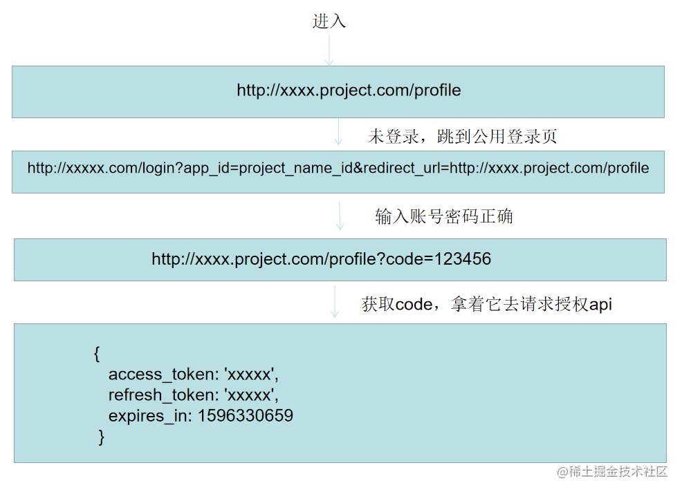 http://xxxx.project.com/profile需要登录,未登录就跳转至 SSO 登录平台,此时的登录网址 url 为http://xxxxx.com/login?app_id=project_name_id&redirect_url=http://xxxx.project.com/profile,其中app_id是后台那边约定定义好的,redirect_url是成功授权后指定的回调地址。输入账号密码且正确后,就会重定向回刚开始进入的页面,并在地址栏带一个参数