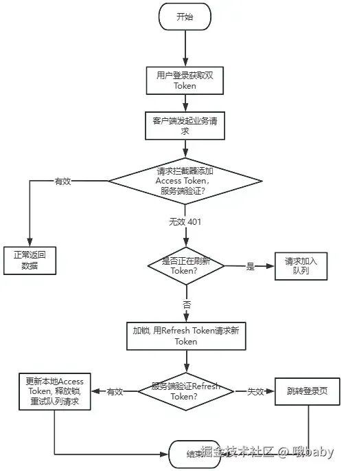// 添加响应拦截器service.interceptors.response.use( response => response, // 成功的响应直接返回 async error => { const originalRequest = error.config; //originalRequest._retry 是一个自定义属性,用于标记请求是否已经重试过。 //1、判断是不是token过期 if (error.response.status === 401 && !originalRequest._retry) { originalRequest._retry = true; // 显式标记请求为重试 //2、并且不是重新获取token的401,则进行token刷新 if (!isRefreshing) { isRefreshing = true; // 重新请求access_token try { const accessToken = await refreshToken() // 更新localstorage中的access_token localStorage.setItem('access_token', accessToken); //配置请求头 originalRequest.headers['Authorization'] = `Bearer ${accessToken}`; // 处理队列中的其他请求 processQueue(null, accessToken); // 重新发起失败的请求 return service(originalRequest) } catch (err) { // 处理队列中的请求 processQueue(err, null); console.log("刷新token失败,跳转登录界面", err) // 重定向到登录页 router.push('/login') } finally { isRefreshing = false; //isRefreshing设置为false } } else { //如果正在刷新token,则将请求加入队列 return new Promise((resolve, reject) => { failedQueue.push({ resolve, reject }); }) } } // 如果不是401错误,则直接抛出错误 return Promise.reject(error); });流程图