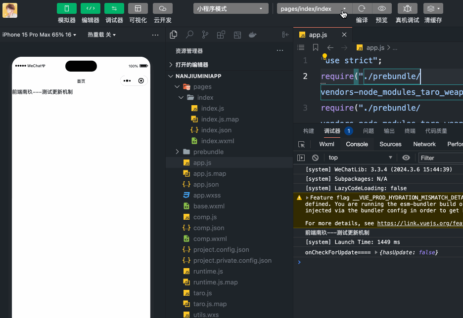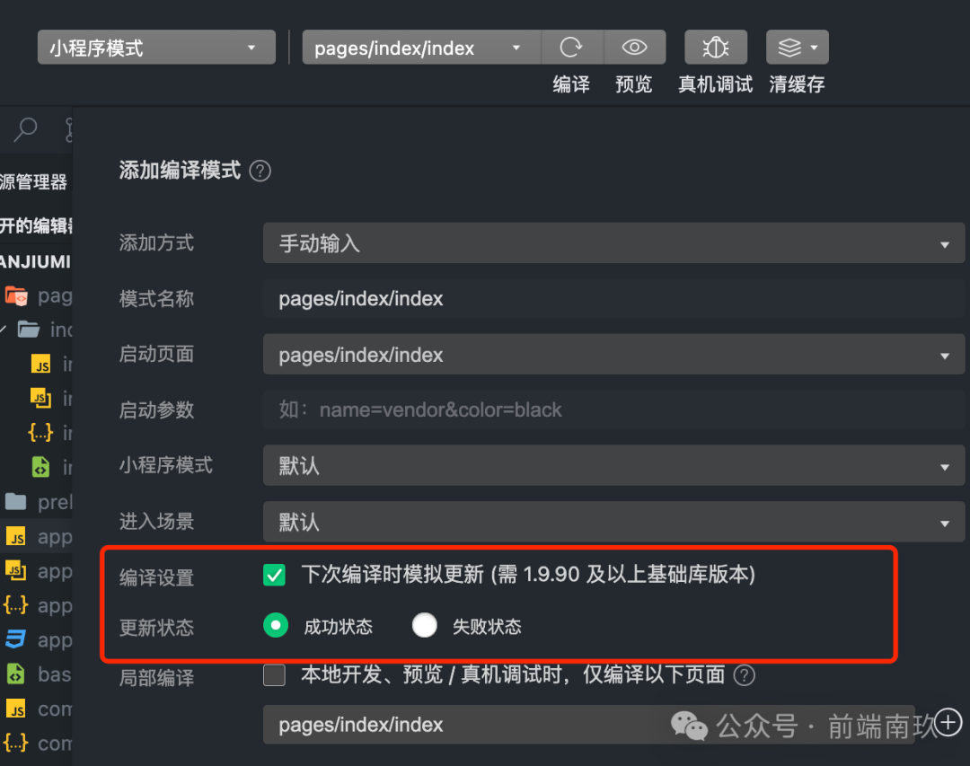 if (taro.canIUse('getUpdateManager')) { const updateManager = taro.getUpdateManager(); updateManager.onCheckForUpdate(function (res) { console.log('onCheckForUpdate====', res); if (res.hasUpdate) { // 小程序已更新 updateManager.onUpdateReady(function () { taro.showModal({ title: '更新提示', showCancel: false, confirmText: '立即重启', content: '新版本已经上线,是否重启小程序以应用新版本?', success: function (res) { if (res.confirm) { // 调用 applyUpdate 应用新版本并重启 updateManager.applyUpdate(); } } }); }); // 更新失败 updateManager.onUpdateFailed(function () { taro.showModal({ title: '更新失败', content: '新版本下载失败,请删除当前小程序后重新打开。', }); }); } }); } else { // 版本过低 taro.showModal({ title: '提示', content: '当前微信版本过低,无法使用该功能,请升级到最新微信版本后重试。', }); }因为小程序的开发版和体验版没有版本的概念,所以无法在开发版和体验版上测试更版本更新情况,但可以通过微信开发者工具 => 添加编译模式 => 编译设置 => 下次编译时模拟更新来进行调试