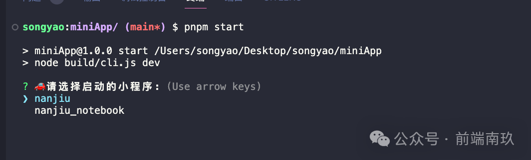 // cli.jsconst shell = require('shelljs')const fs = require('fs')const path = require('path')const inquirer = require('inquirer')const action = process.argv[2]let app = process.argv[3]const runType = action == 'dev' ? '启动': '打包'if(!app) { openInquirer() return}// 未输入项目名称则开启交互命令行function openInquirer() { const projectList = fs.readdirSync(path.resolve(__dirname, '../src/apps')) // 过滤隐藏文件 projectList.forEach((item, index) => { if(item.indexOf('.') == 0) { projectList.splice(index, 1) } }) const promptList = [ { type: 'list', message: '🚗请选择启动的小程序:', name: 'pro', choices: [...projectList], }, ] inquirer.prompt(promptList).then((answers) => { app = answers.pro start() })}function start() { // 处理配置文件 process.env.APP = app console.log(`🚀🚀🚀🚀🚀🚀正在${runType}小程序:${app}`) let cmd = '' if(action == 'dev') { cmd = `taro build --type weapp --watch --app ${app}` } else { cmd = `taro build --type weapp --app ${app}` } const child = shell.exec(cmd, {async:true}) child.stdout.on('data', function() { // console.log(data) })}start()这样就大功告成了!!!