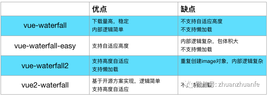 vue2-waterfall[4]:通过对 masonry-layout 和 imagesloaded 这两个开源方案的封装来实现,逻辑简单明了。
