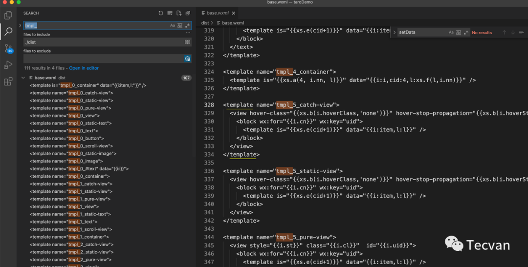 根据我们之前的分析,在最后生成的文件中,一定包含了一个**「小程序渲染器」**。它接受的data就是整个ui结构,然后通过小程序的渲染能力渲染到界面上,我们去dist文件中找一下,就能找到一个base.ttml 的文件,里面的内容是这样的