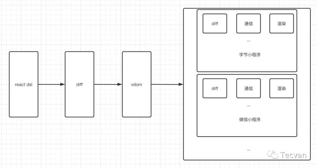 前面三个流程都在我们的js层,也就是开发层,我们写的代码经历一遍完整的 react 流程之后,会将最后的结果给到各个小程序,然后再走小程序自己的内部流程,将其真正的渲染到界面上。