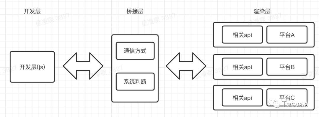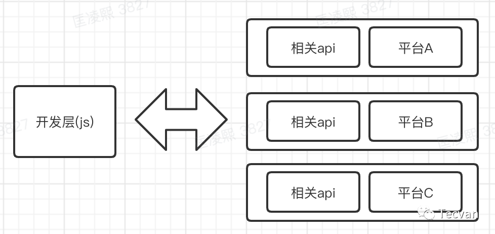 function render() { if(A) { message.sendA('render', { type: 'View' }) } if(B) { message.sendB('render', { type: 'View' }) } if(C) { message.sendC('render', { type: 'View' }) }}比如这样,我就能通过判断平台来通知对应的端去渲染View组件。这一部分的工作就是跨端框架需要帮助我们做的,它可以把这一步放到 JS 层,也可以把这一步放到c++ 层。我们应该把这部分工作尽量往底层放,也就是我们可以对各个平台的 api 进行一层封装,上层只负责调用封装的 api,再由这一层封装层去调用真正的 api。因为这样可以复用更多的逻辑,否则像上文中我们在 JS 层去发送消息给不同的平台,我们就需要在 A\B\C 三个平台写三个不同方法去渲染组件。