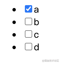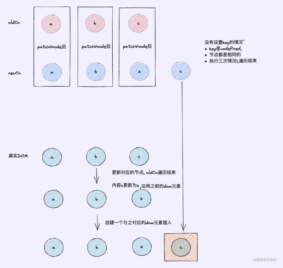 因为没有设置 key, 默认都是 undefined, 所以节点都是相同的, 更新了 text 的内容但还是沿用了之前的 dom, 所以实际上a->z(a原本打勾的状态保留了,只改变了text),b->a,c->b,d->c, 遍历完毕发现还要增加一个 dom, 在最后新增一个 text 为 d 的 dom 元素