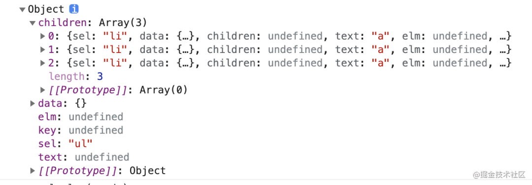 let vnode = h('ul.list', [ h('li','a'), h('li','b'), h('li','c'),])console.log(vnode)3.1.1 控制台打印出来的「Vnode」: