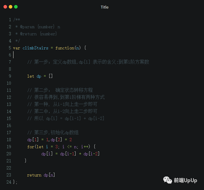 dp[1] = 1,dp[2] = 2按照这个三步走的话,我们就可以写出完整的解题代码