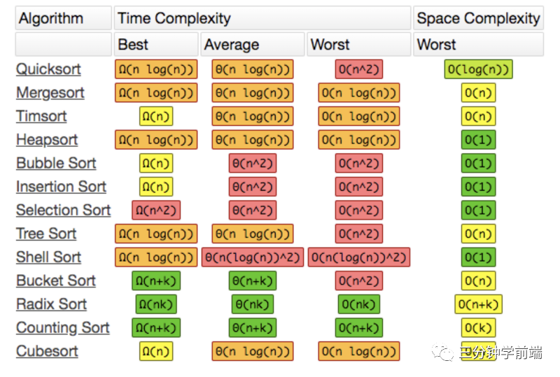 // 桶排序let bucketSort = (arr) => { let bucket = [], res = [] arr.forEach((value, key) => { // 利用映射关系(出现频率作为下标)将数据分配到各个桶中 if(!bucket[value]) { bucket[value] = [key] } else { bucket[value].push(key) } }) // 遍历获取出现频率 for(let i = 0;i <= bucket.length - 1;i++){ if(bucket[i]) { res.push(...bucket[i]) } } return res}复杂度分析: