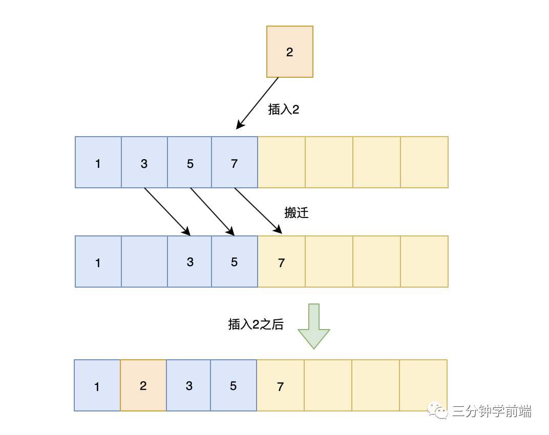 function insertionSort(arr) { let n = arr.length; let preIndex, current; for (let i = 1; i < n; i++) { preIndex = i - 1; current = arr[i]; while (preIndex >= 0 && arr[preIndex] > current) { arr[preIndex + 1] = arr[preIndex]; preIndex--; } arr[preIndex + 1] = current; } return arr;}插入算法的核心思想是取未排序区间中的元素,在已排序区间中找到合适的插入位置将其插入,并保证已排序区间数据一直有序。重复这个过程,直到未排序区间中元素为空,算法结束。