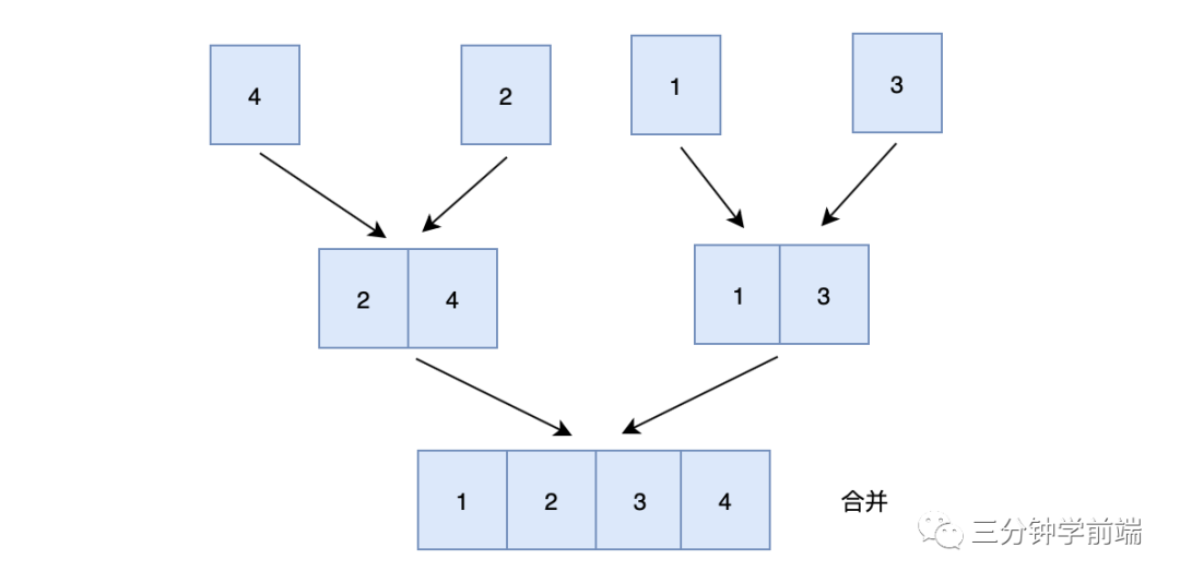不断合并小数组,直到合并称一个数组,则为排序后的数组序列