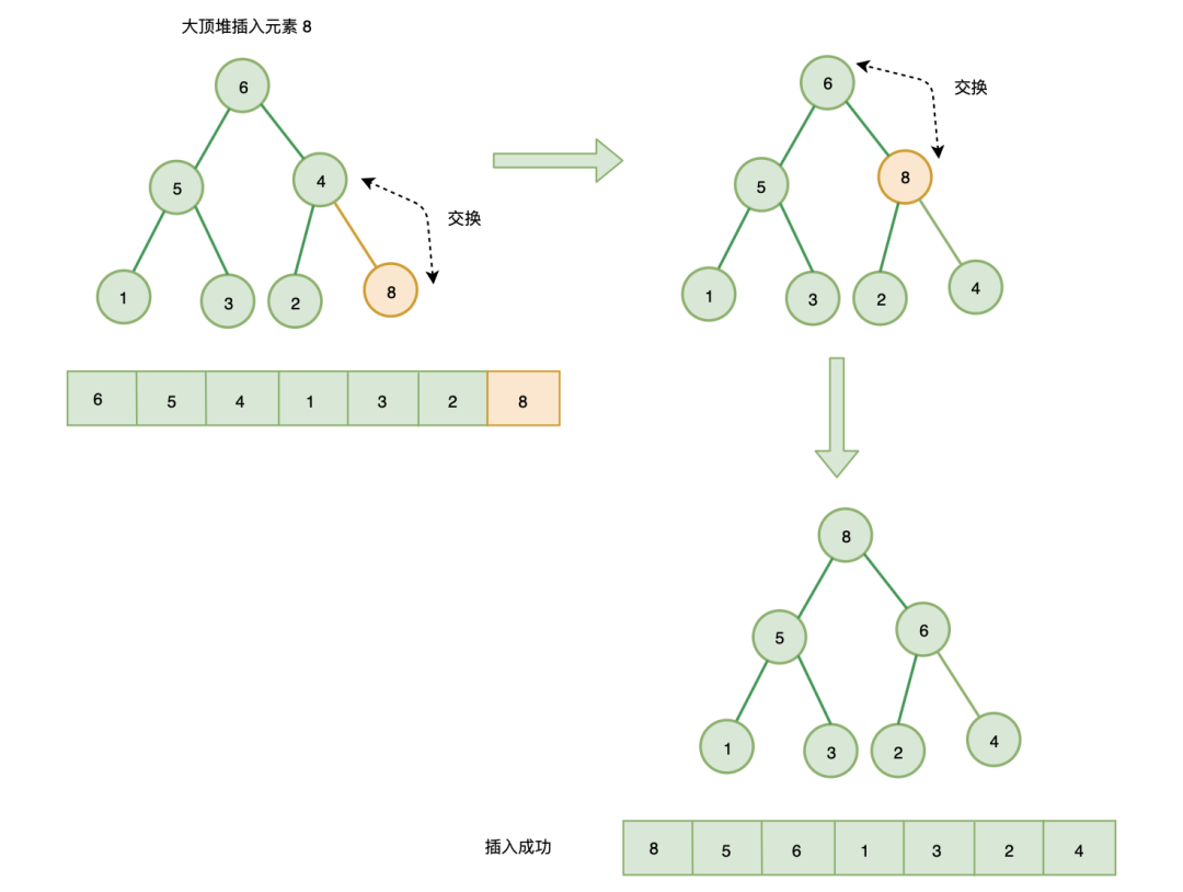 自下往上堆化: 将插入节点与其父节点比较,如果插入节点大于父节点(大顶堆)或插入节点小于父节点(小顶堆),则插入节点与父节点调整位置
