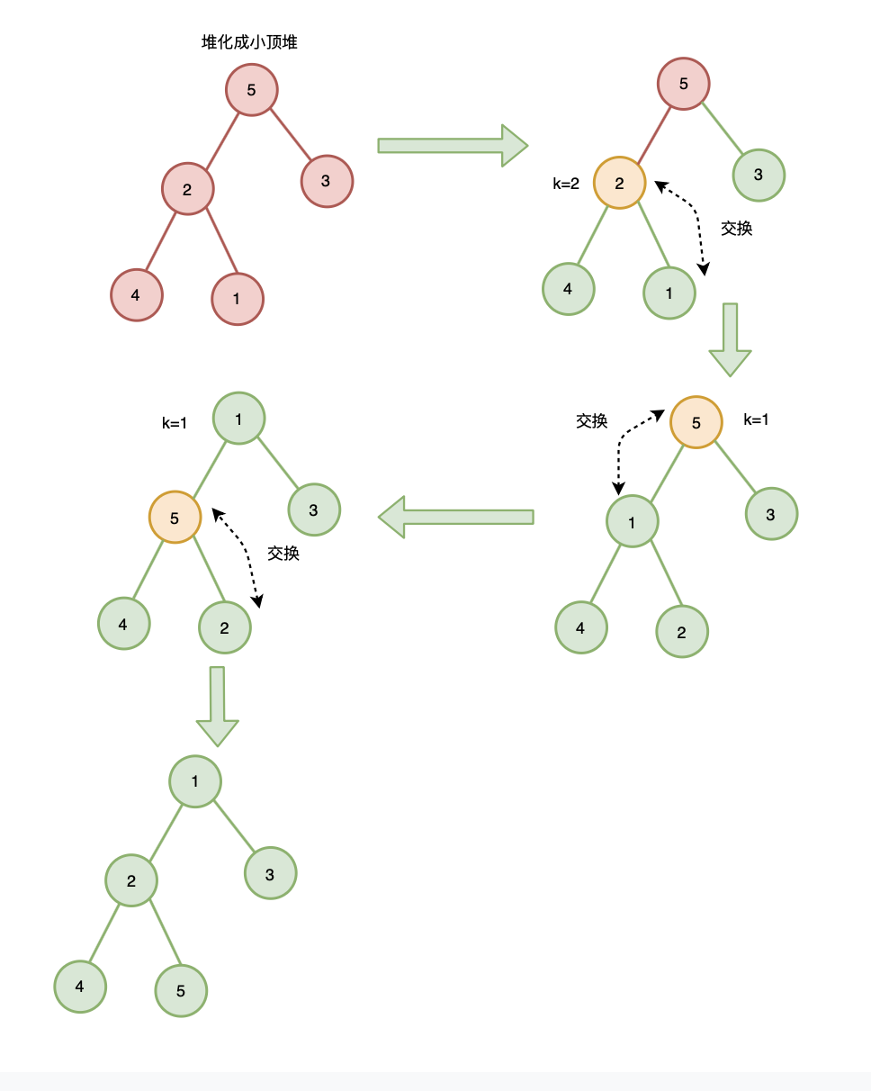 // 原地建堆// items: 原始序列// heapSize: 有效序列长度,上图用 k 表示function buildHeap(items, heapSize) { // 从最后一个非叶子节点开始,自上而下式堆化 for (let i = Math.floor(heapSize/2); i >= 1; --i) { heapify(items, heapSize, i); }}function heapify(items, heapSize, i) { // 自上而下式堆化 while (true) { var maxIndex = i; if(2*i <= heapSize && items[i] > items[i*2] ) { maxIndex = i*2; } if(2*i+1 <= heapSize && items[maxIndex] > items[i*2+1] ) { maxIndex = i*2+1; } if (maxIndex === i) break; swap(items, i, maxIndex); // 交换 i = maxIndex; }} function swap(items, i, j) { let temp = items[i] items[i] = items[j] items[j] = temp}// 测试var items = [,5, 2, 3, 4, 1]// 因为 items[0] 不存储数据// 所以:heapSize = items.length - 1buildHeap(items, items.length - 1)console.log(items)// [empty, 1, 2, 3, 4, 5]测试成功