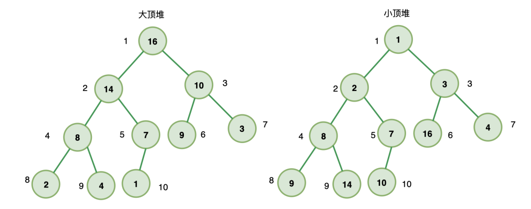 如果堆上的任意节点都大于等于子节点值,则称为 大顶堆