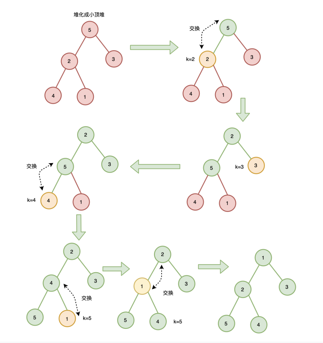 自上往下式堆化 :将节点与其左右子节点比较,如果存在左右子节点大于该节点(大顶堆)或小于该节点(小顶堆),则将子节点的最大值(大顶堆)或最小值(小顶堆)与之交换