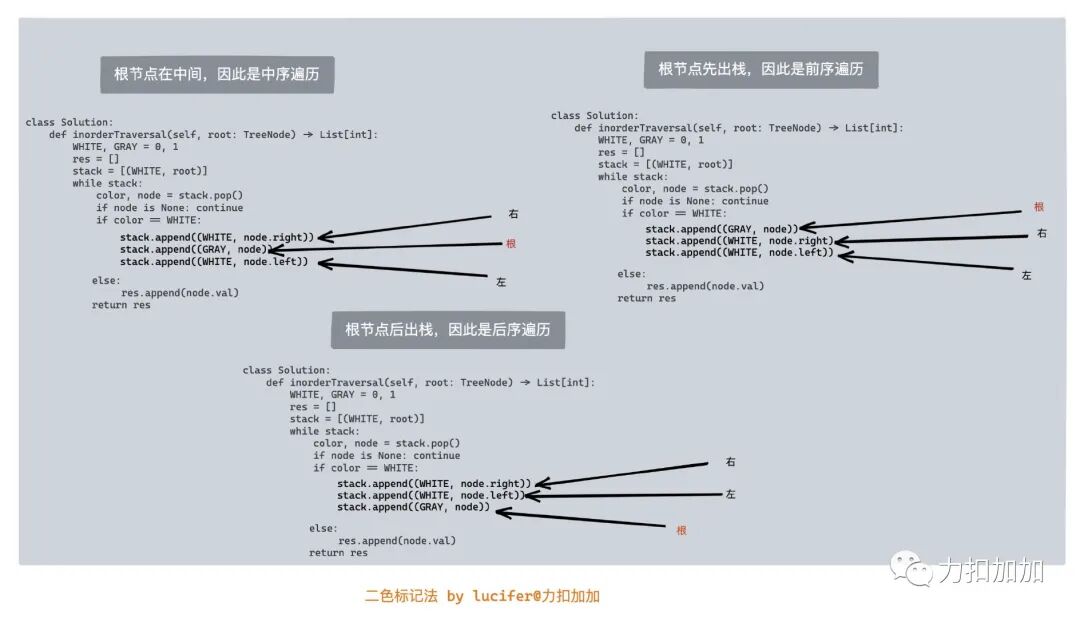 class Solution: def inorderTraversal(self, root: TreeNode) -> List[int]: WHITE, GRAY = 0, 1 res = [] stack = [(WHITE, root)] while stack: color, node = stack.pop() if node is None: continue if color == WHITE: stack.append((WHITE, node.right)) stack.append((GRAY, node)) stack.append((WHITE, node.left)) else: res.append(node.val) return res可以看出,实现上 WHITE 就表示的是递归中的第一次进入过程,Gray 则表示递归中的从叶子节点返回的过程。因此这种迭代的写法更接近递归写法的本质。